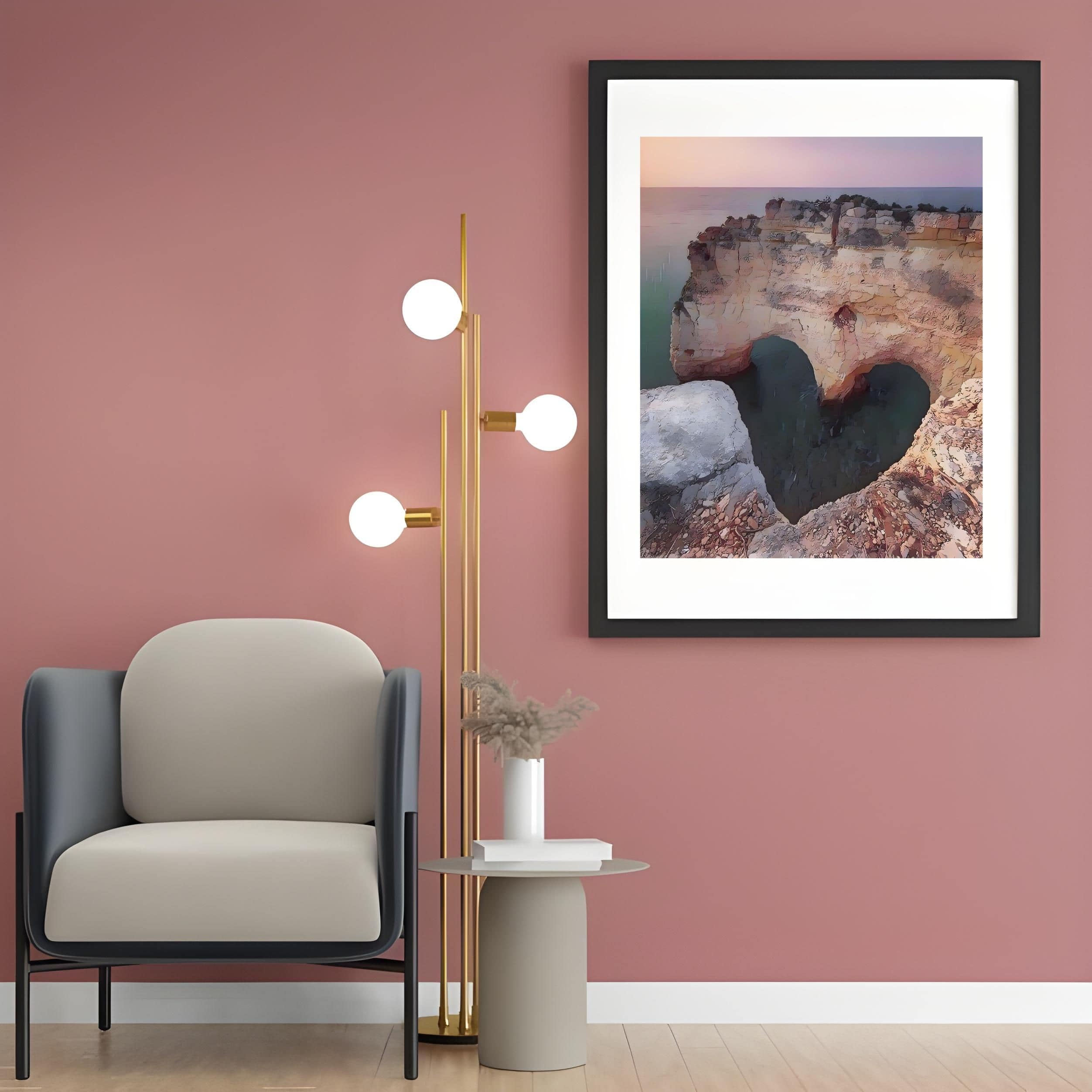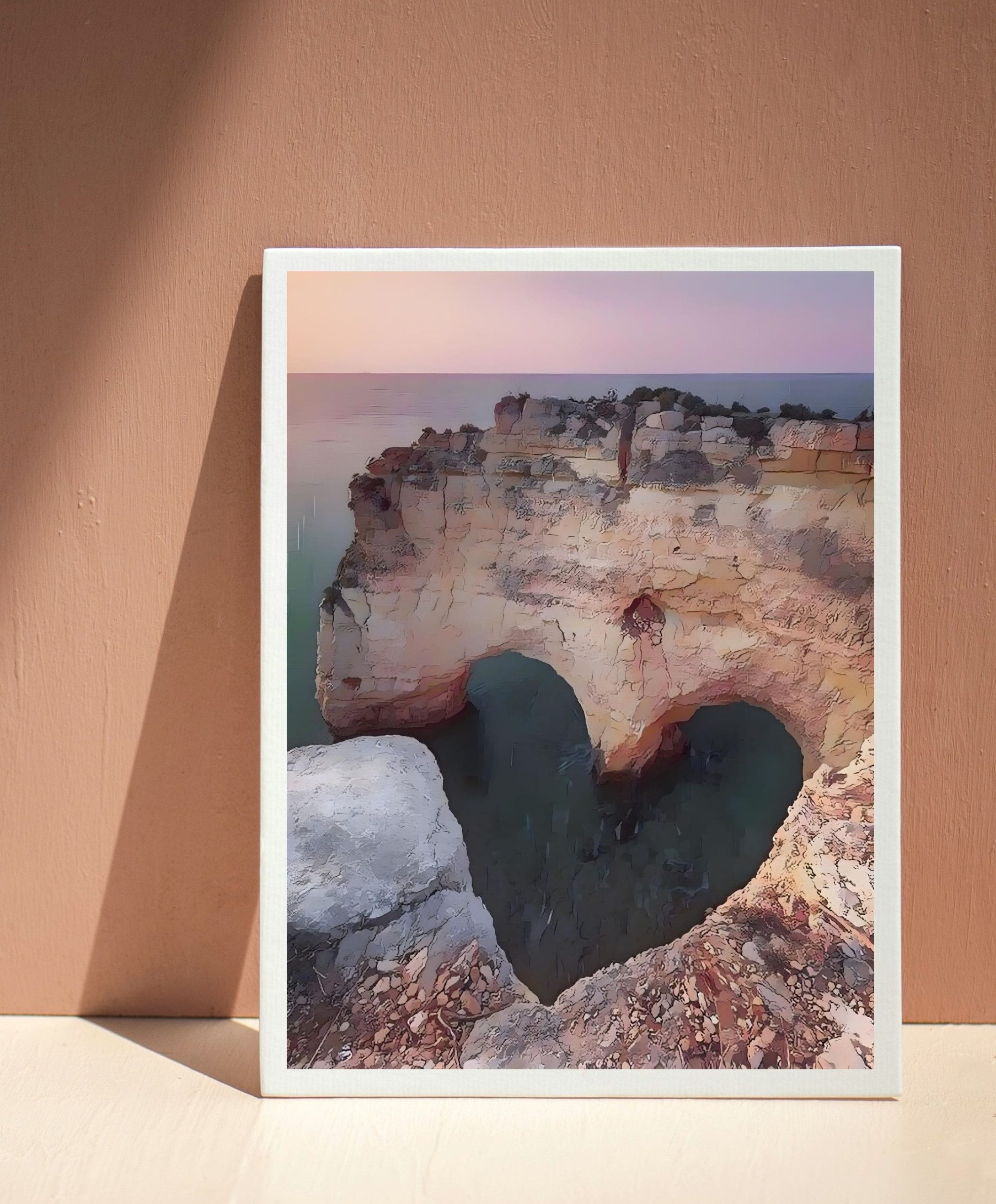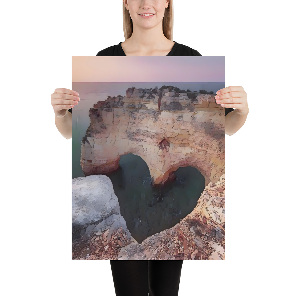 The artwork is all about travel illustration, featuring the heart-shaped rock in Algarve, Portugal. It can be used to decorate empty walls in living rooms, dinning rooms, bedrooms, offices, etc.