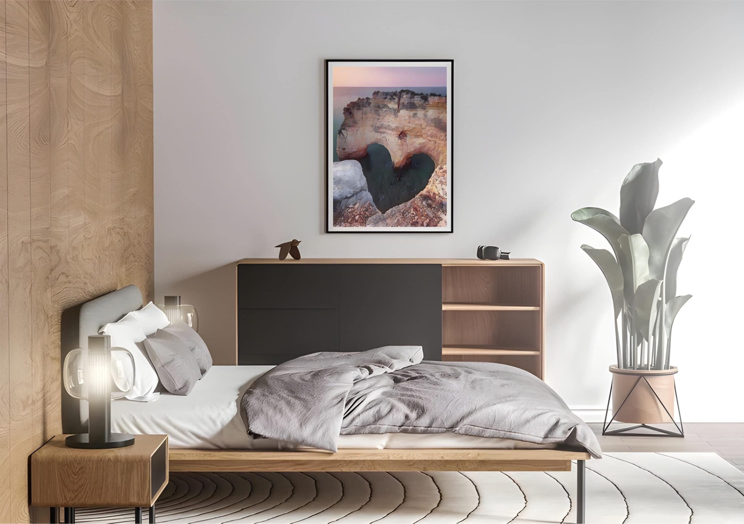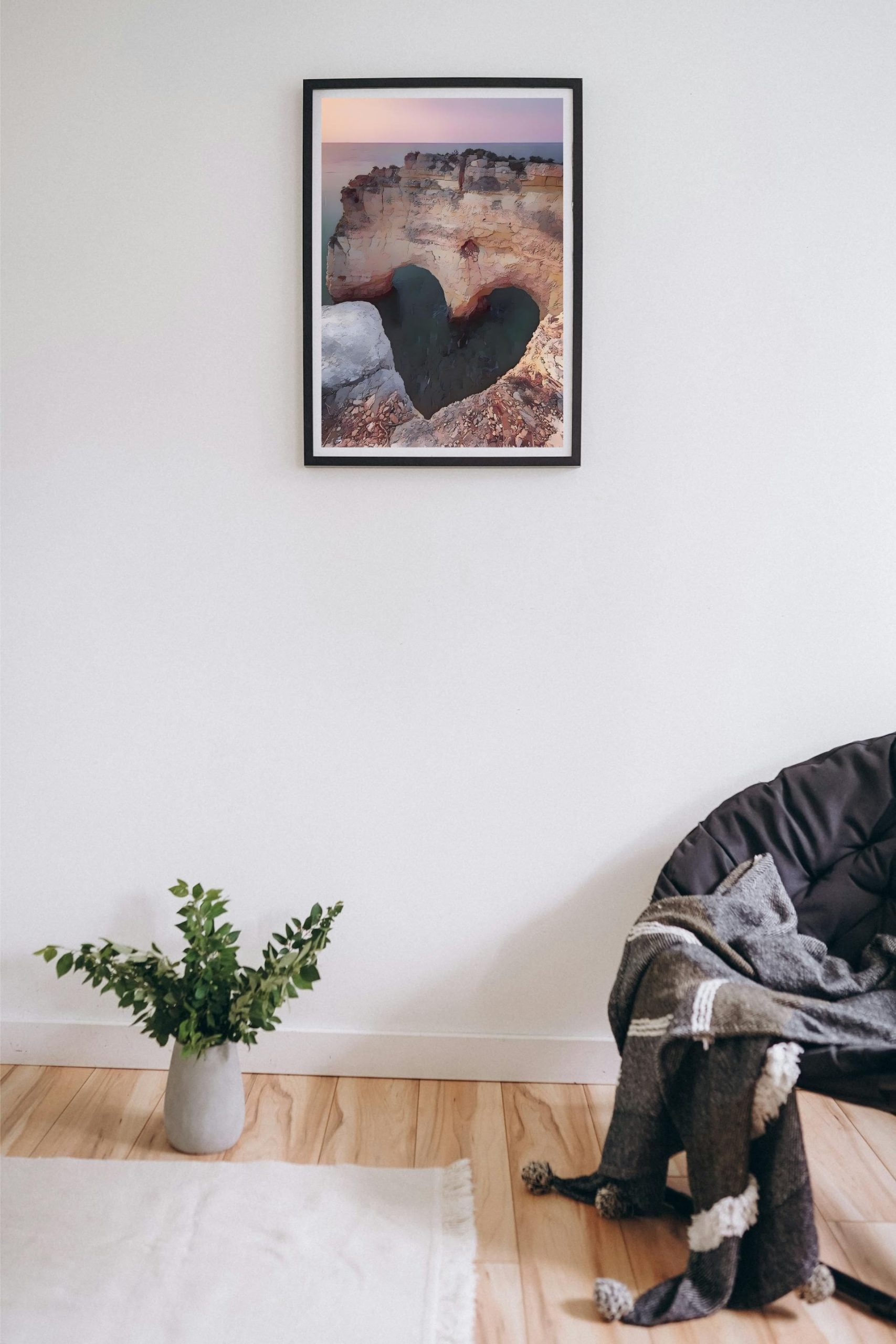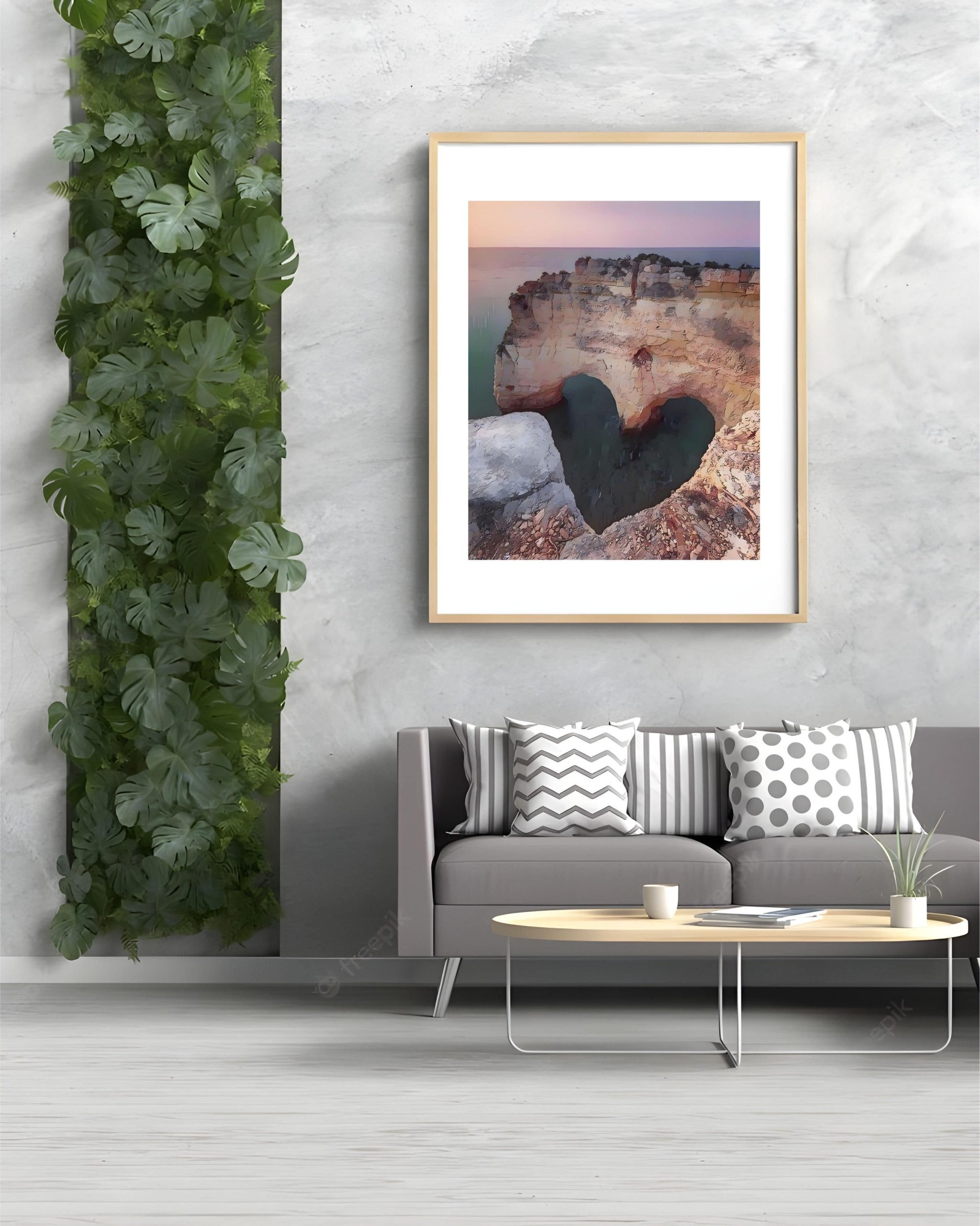 The artwork is all about travel illustration, featuring the heart-shaped rock in Algarve, Portugal. It can be used to decorate empty walls in living rooms, dinning rooms, bedrooms, offices, etc.