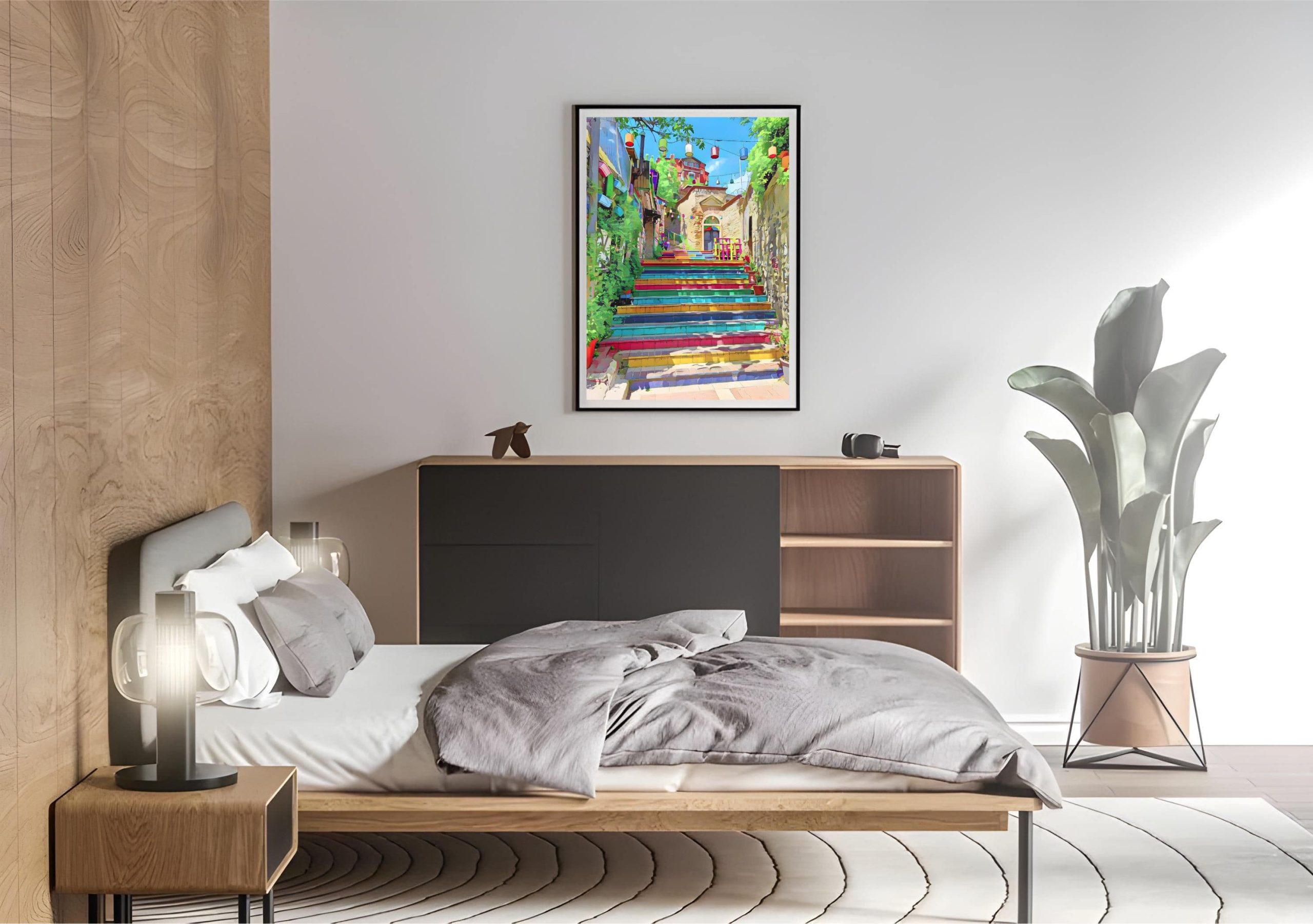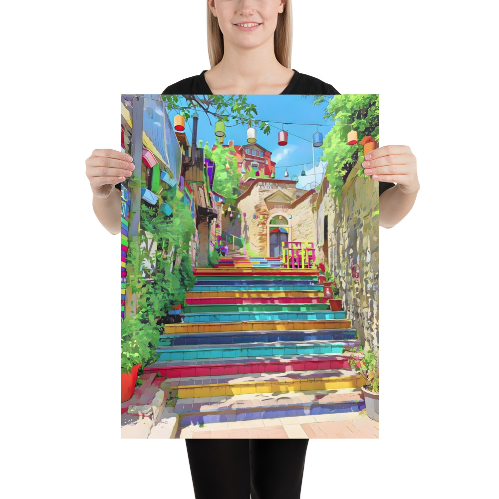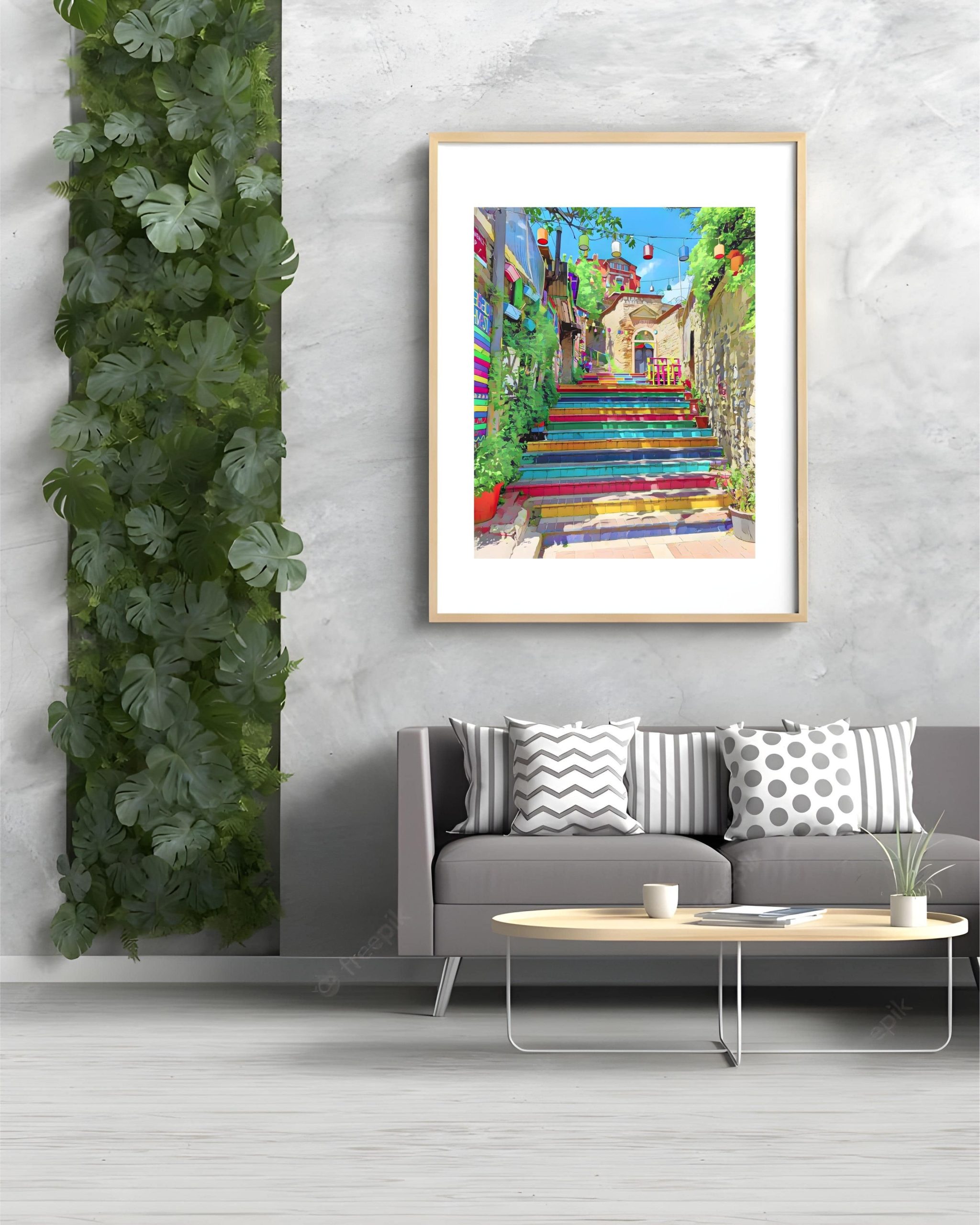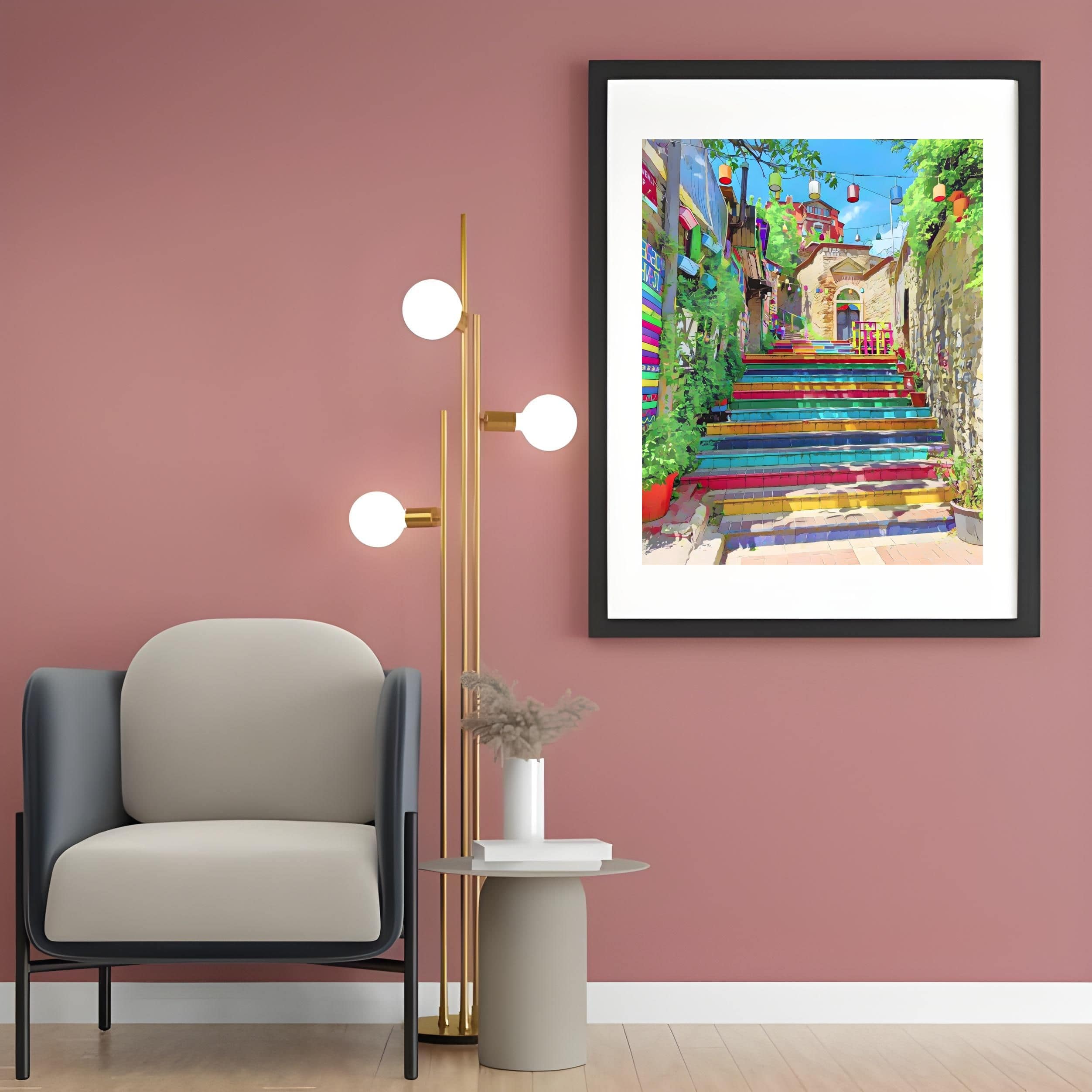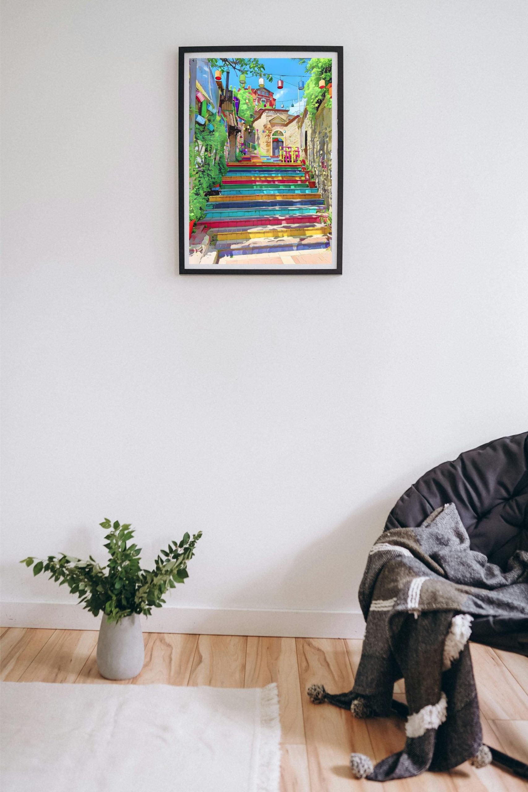 The artwork is all about travel illustration, featuring the Rainbow Stairs, Istanbul, Turkey. It can be used to decorate empty walls in living rooms, dinning rooms, bedrooms, offices, etc.